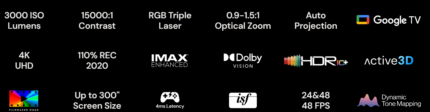 La série VisionMaster regroupe des projecteurs 4K utilisant la technologie RGB triple-laser, une plateforme smart commune (Google TV) et une large gamme de couleurs précises. Les différences portent principalement sur la luminosité, la gestion des noirs, l’optique et la flexibilité d’installation.